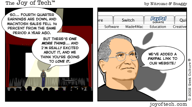 If you're using a Mac and a newer version of Explorer, here's a neat trick courtesy of MacMerc. Drag the above little image to the top tool bar of your browser, it should "stick" afterwards. Now you have a graphical link to the Joy of Tech, one that will update everytime a new comic is uploaded. (You may have to refresh the image manually if it's in your cache.) If you need to delete or move it it, just control button/click and hold, then select delete, or just Command/drag it to the trash.