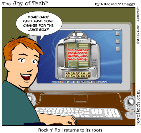 If you're using a Mac and a newer version of Explorer, here's a neat trick courtesy of MacMerc. Drag the above little image to the top tool bar of your browser, it should "stick" afterwards. Now you have a graphical link to the Joy of Tech, one that will update everytime a new comic is uploaded. (You may have to refresh the image manually if it's in your cache.) If you need to delete or move it it, just control button/click and hold, then select delete, or just Command/drag it to the trash.
