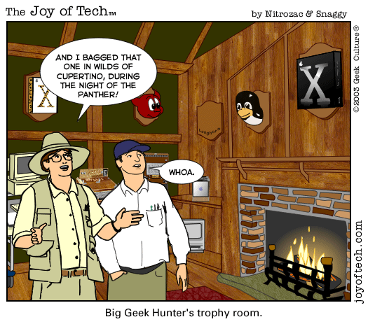 If you're using a Mac and a newer version of Explorer, here's a neat trick courtesy of MacMerc. Drag the above little image to the top tool bar of your browser, it should "stick" afterwards. Now you have a graphical link to the Joy of Tech, one that will update everytime a new comic is uploaded. (You may have to refresh the image manually if it's in your cache.) If you need to delete or move it it, just control button/click and hold, then select delete, or just Command/drag it to the trash.