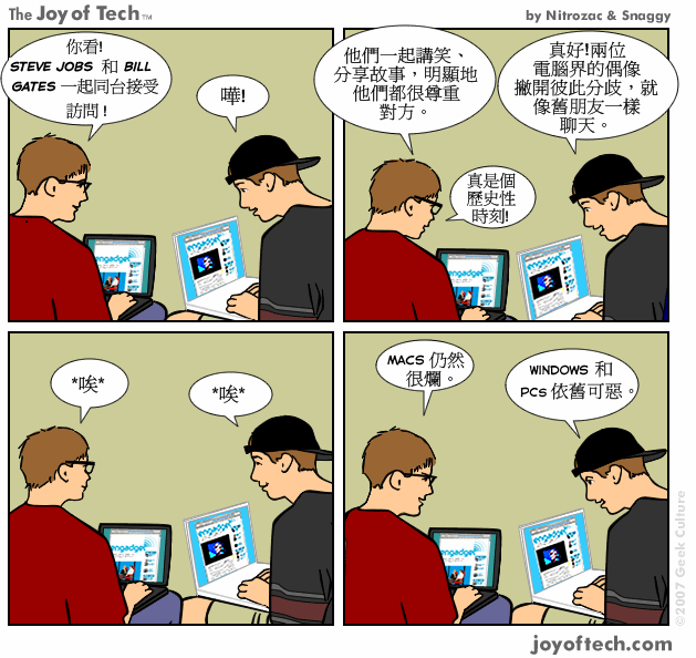 The Joy of Tech is a comic about technology and pop culture. We like to feature the people and events that are making tech news. We tend to focus on Apple news and events because they often affect the industry in general, and because we are longtime Mac users here at GeekCulture Headquarters. We create The Joy of Tech using Apple computers, mostly on our PowerBooks, running Mac OS X Tiger. We use software from Apple, Adobe, Macromedia, BBedit, and others, including Microsoft (yep, we do use Microsoft Office for Mac on occasion). Nitrozac uses a Wacom tablet to do her illustrations.