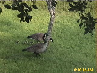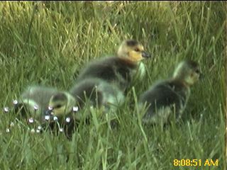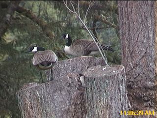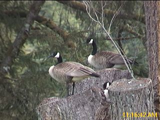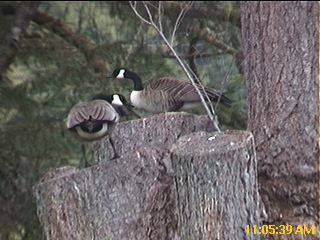 | The Canada Geese that were nesting in the tree had their family hatch! In a very interesting event, a number of geese came over to check out the new chicks. At first we thought it was an attack, there was quite a commotion and lots of honking. It seemed like at least two of the geese were protecting the mother, standing as guards right up there on the nest, while the dad was down below keeping others away. |