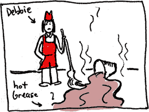 | I was there for about one week until Debbie arrived. She was going to make this job her career. She packed circles around me. Fast as lightning, real manager material. That was the first time I experienced employee competiveness. I reassured her I did not want to make a career out of a chicken packing job, but she continued to hate me anyway. It was hate, a quiet, silent hate. She'd always mop the floor and make sure to run the greasy mop over my running shoes, gross! Well, she got what was coming to her, in her big hurry she spilt a pot of hot grease (yes, they recycled the grease until it smelled bad), all over the floor, I didn't help her mop up, no way... |