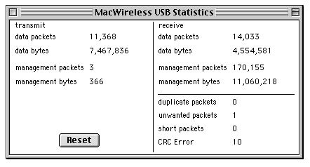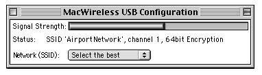 WiFi range was also comparable. I found the USB adapter didn't have quite the range of an original airport card, but it was fairly close (within a few feet). I did notice however that the USB adapter seemed a little more susceptible to physical obstacles, according to the Signal Strength meter. I had some issues while using the USB adapter on the PowerMac 8600/300, which we use here at Geek Culture Headquarters to run our webcam. While using it with EvoCam, or when keeping the Control Panel open, the computer was much more likely to hang than with a standard ethernet connection to the web. Switching to another webcam software, Oculus, seemed to solve this problem though. So, is it for you?Well, if you have the slot for a regular AirPort card or other built in wireless card, you'll probably want to use that, but if you have an older desktop G3 or early G4 (the Yikes family), especially one that has USB already, this unit is just the ticket to get WiFi fast. The fact that you can easily switch it over to other computers is also a plus.