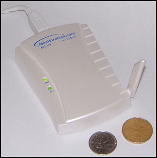 I recently had the opportunity to test drive a MacWireless 802.11b USB Adapter. It's a neat idea, a wireless card in a compact form factor, that just plugs into your USB port.
