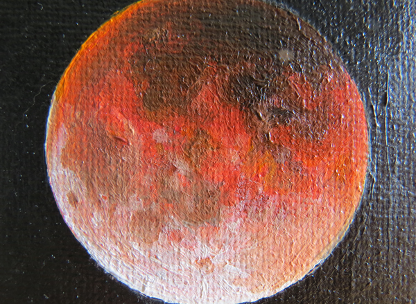 Lunar eclipse painting, with easel This painting was a delight to work on. Despite being small, I think it really captures the majesty of a lunar eclipse. Its demure size makes it more personal, like a memory you can tuck away into a pocket. Every time I look at it, I remember the feeling of wonder I have seeing our gorgeous moon turn a deep red color, and seeing all the stars beside the Moon that are usually lost in the glare. During a lunar eclipse, one really understands that there's a planet out there! This sense of wonder about our solar system is a feeling we too often forget, but with this little gem in your life, it is only a glance away. I know the new owner of this delightful object will enjoy it as much as I do. Details: Lunar eclipse, an original painting, on 2.5 x 2.5 inch stretched canvas, with a wooden frame. The painting is about a quarter inch thick, with painted sides, so you can display it as is, on the wooden frame, or however you wish. The back of the painting contains the title, the date painted, Nitrozac's signature, and a fingerprint for authenticity.