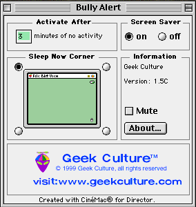 ![]() This screensaver is available for both Windows or Macintosh. How to install the Mac screen saver: Place the control panel file, "Bully Alert", into your Control Panels folder, in your System Folder. To avoid any conflicts, make sure that it's the only screen saver in your Control Panels folder. Restart your computer to enjoy the screen saver! You can adjust screen saver preferences by opening the Bully Alert control panel. To turn off the sound, just select the Mute button. Note: For those of you using FreePPP, there is a bug in FreePPP 2.6.x, that conflicts with screen savers built using Cinemac (as ours are). The solution, either use PPP (free from Apple) which is reportedly faster, or use FreePPP 2.5.x. |