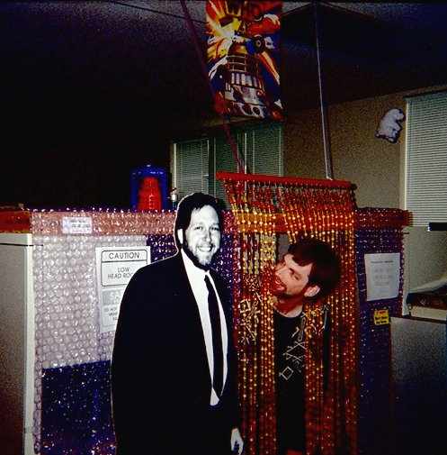 "I've enclosed a photo of one of my co-workers, David Slater, and his work environment. Please allow me to point out some of the salient features of this special workplace (we alternate between the terms 'geekosphere' and 'nerdhole' depending how much we're liking Dave that week). Dave's geekosphere is an enclosed cubicle. Note the roof, which was constructed of discarded shipping boxes from our warehouse with the assistance of engineering graduates. The curtains are crafted from the finest large-scale bubble wrap, to provide some sonic baffling. The entranceway is a totally old-school bead curtain which is actually a relic of the sixties. Some SF geekiness is displayed by the Dr. Who poster hanging over the entranceway. Further evidence is to be found in the models of a dalek and the tardis on the roof. The signs, an amusing "Low Headroom" warning on the left, and a quote from Dante's Infero(*) in Italian on the right add to the ambiance. The guardian of the nerdhole is a life-size cardboard cut-out of David Litwack, who was once one of our fearless leaders in the days before Powersoft was part of Sybase. Please don't ask why there is a Coke bear flying in space in the background." |