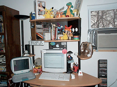 This is my hole. I spend roughly 75% (maybe more) here playing EverQuest, Diablo II (and any other variety of computer game), checking my email, designing webpages, etc. You can see a lot of anime or anime-esque stuffed animals and actions figures floating around all over the place (Ryo-Ohki, Pikachu, Quistis Trepe) as well as my eclectic choice in computers (my iBook right next to my PC) Overall, it's nothing TOO unusual, save my collection of stickers and signs... |