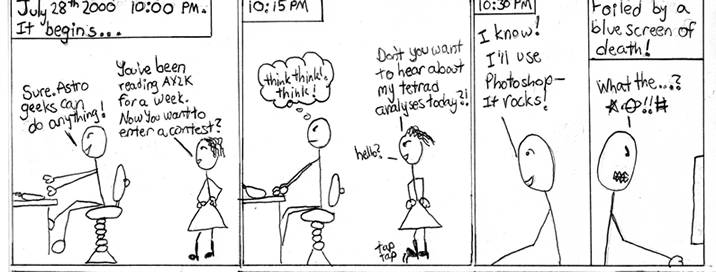 I just started to read the comic recently and thought I'd give a whirl for the contest in Nitro's own medium...I have gained an enormous amount of respect for anyone who picks up the pen to do this....It's hard! so the items: 1. Me : astro grad student->means I'm a geek -> there's the geek in AY2K, drawn by Nitrozac 2. date and time: the year 2000, the beginning year of AY2K, also the final entry date of the contest! (whooo!) 3. this is a comic: just like AY2K 4. self-references: just like Nitrozac but she does it better! 5. my girlfriend wears sexy boots: just like Nitrozac 6. my girlfriend is a total TTB: she's a hottie _and_ a biology grad student, ergo a techno talking babe with genetic powers :), just like the TTBs in AY2K 7. Photoshop: one of the many tools Nitrozac uses to publish her comic 8. Pizza and coffee: main staples of the Geek, character in AY2K 9. AIBO: robotic dog similar to the one created by the Geek. 10. a bathroom: the room Bill Gates is stuck in in AY2K 11. abacus: one way to get around the y2k bug in Ay2k--I actually knew someone who collects vacuum tubes, but that's random... 12: power outages: just like those experienced due to the y2k bug 13. D'oh: famous expression by Homer Simpson, a cartoon and comics character, just like those in AY2K. 14. My Martha Stewart curtains: I own Martha Stewart curtains. Martha is a character in AY2K. 15. tetrad analysis: a biological technique used to study yeast genes. yeast is a main component of bread doughs. bread dough is essential for pizza, which is already linked to AY2K 16. red glow in Aibo's eyes: reference to the Terminator, of which Arnold Schwarzzenager(sp?) is a star. Arnie is buff just like Linus Torvalds' shower scene in AY2K. |