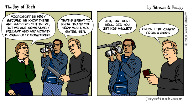Welcome to the Joy of Tech... illustrated by Nitrozac and written by Nitrozac and Snaggy. It's a little bit simpler in style than our other comic After Y2K, and a little more topical. We hope you enJoy!