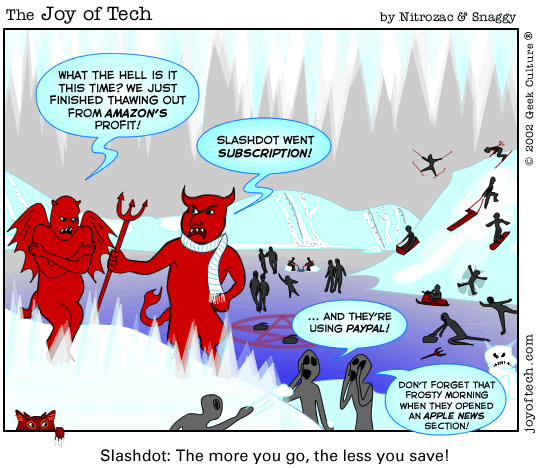 ![]() Mac Genius t-shirts! ![]() Posters! ![]() The TTB t-shirt! NOW IN STOCK! ![]() Beanies! Relevancy Link: Announcing Slashdot Subscriptions |
