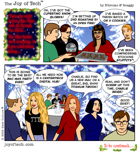 If you're using a Mac and a newer version of Explorer, here's a neat trick courtesy of MacMerc. Drag the above little image to the top tool bar of your browser, it should "stick" afterwards. Now you have a graphical link to the Joy of Tech, one that will update everytime a new comic is uploaded. (You may have to refresh the image manually if it's in your cache.) If you need to delete or move it it, just control button/click and hold, then select delete, or just Command/drag it to the trash.