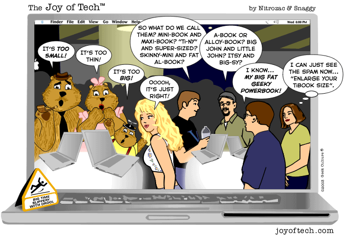 If you're using a Mac and a newer version of Explorer, here's a neat trick courtesy of MacMerc. Drag the above little image to the top tool bar of your browser, it should "stick" afterwards. Now you have a graphical link to the Joy of Tech, one that will update everytime a new comic is uploaded. (You may have to refresh the image manually if it's in your cache.) If you need to delete or move it it, just control button/click and hold, then select delete, or just Command/drag it to the trash.