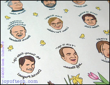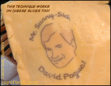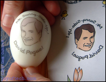 ![]() Now comes the exciting part! Carefully roll an egg over an image, trying not to repeat roll, and making sure you roll over all of the text too. Behold!! With any luck, you should have a rather freaky looking Egghead in your hands! A David Pogue egghead is freshly "hatched!" |