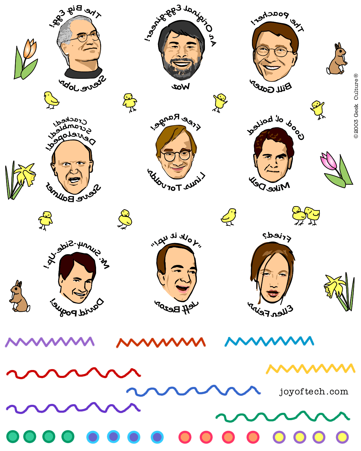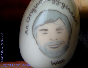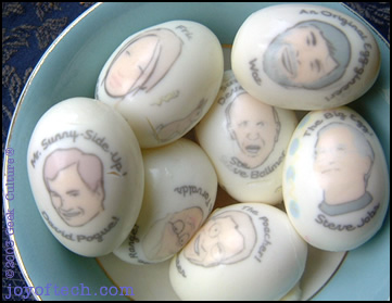 Disclaimer: You will undoubtedly be tempted at some point to eat your eggheads, but please, do not eat the eggheads unless you are using edible vegetable dyes in your inkjet. (Trust me, you are not.) Eggheads may begin to smell if left in your geekosphere for very long periods of time. Do not introduce eggheads into postal systems, or leave them unattended. If eggheads develop into chickens, increase boiling times. |