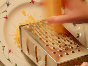 Grate the cheese! Try not to eat it all! Oh my, that aged Canadian cheddar cheese is incredible!