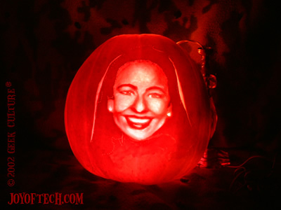 What would Halloween be without Jack O'Lanterns... with a Joy of Tech twist! We decided to do some pumpkin carving this year, so after Nitrozac did some research on the web, we applied that knowledge to some suitable pumpkin specimens!