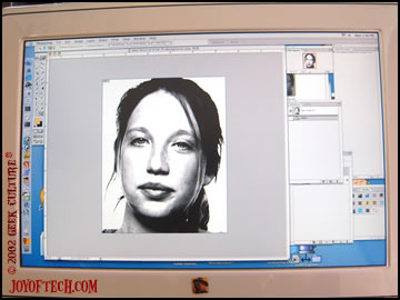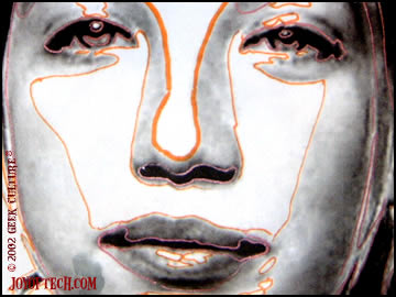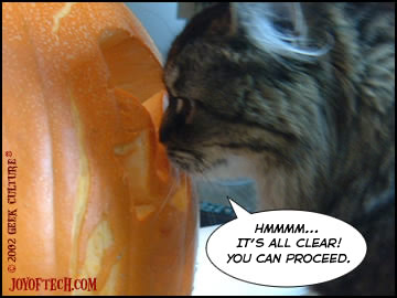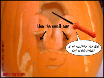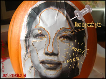 Next, you're going to divide the image into areas of white, grey, and black. Trace the outside edges of the pure white areas on your image. Theses are the areas that you will carve completely out. Be sure there is nothing inside the white areas or else it will be unsupported! With another color, draw a line between the black and gray areas. Sometimes it's hard to decide where the line should go, but do your best, you can always tweak a bit during the carving stage. The pattern will start to look like a topographical map, cool! Draw a circle-like shape on the top of the pumpkin to mark where to cut out the top. Make the circle more towards the back, so it will leave ample space for your carving on the front, yet enough room for your hand to reach inside the pumpkin. Pull out the insides onto a sheet of newspaper, and get out as much with your hand as possible. Then, take a large spoon, or a scooper like the one in a Pumpkin Carving Kit (available in grocery store with the pumpkins), and scrape it as clean as possible. Trim off the lid's junk with a knife. Wrap up the insides ASAP and toss in the garbage or compost or else it will return to haunt you. Tape the pattern on the pumpkin, making little folds on the edges to compensate for the roundness of the pumpkin, and the flatness of the paper. Snaggy completely taped his Ballmer pattern on the pumpkin with packing tape, and I think that worked very well. Use a pushpin or sharp knife to poke as many holes as you can, following the lines around the white and gray areas. Don't get too sidetracked on developing the perfect pumpkin hole poker and daydream of cashing in on patents, -Snaggy is way ahead of you ;). But I don't recommend using the hole poker in the carving kit, it's useless. Just make sure the holes are big enough to see them clearly, or you will have wasted a ton of poking time. Don't be lazy, and keep poking holes no matter how long it's taking. This is the most important part of the carving, and if you're not diligent, you'll be confused and scared when you peel off the pattern as you can't tell what the heck it is you're supposed to cut out, peel, or leave alone! You may be surprised at the monotony of this task, so it might help to watch TV at the same time, or force a friend to carve one out at the same time. (Hmmm, the perfect pre-Halloween date?) Resolve to yourself that this project is going to take a bit of time, but it will be worth it in the end. It is a great way to spend the evening. |