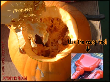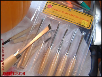![]() Shown here are the tools I used to carve the pumpkins. I highly recommend you use wood carving tools. Don't be cheap. Get these $13.00 tools, otherwise you'll be struggling with those cheap little $2.00 carving tools. These wood carving tools are like the Macs of the carving tools and those cheap dollar store ones are like the PC clones. ;) Select a straight edge tool and gently slice the pumpkin skin around the white areas, and gray areas. Peel off the white areas only for now. It's a good idea to print out a second copy of the design, so you can reference it as you carve the pumpkin. |