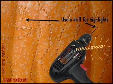 ![]() Depending on your subject, you may want to cut all the way through, or not cut all the way through. Cutting all the way through will leave very bright areas, so in recent years I've been not cutting all the way through. That leaves more options for subtle shading. The more you remove, the brighter the image area. You can always cut all the way later on in the process. If you are cutting all the way through, take a very fine serrated knife, or the small saw in the pumpkin carving kit and completely carve out the white areas. This tool is great because it's dull-ish and creates mushy edges which add a soft touch to the carving. You may need to use the drill again for other highlights such as the small areas on the bottom lip. Keep your head on, and try not to overcut into other areas. |