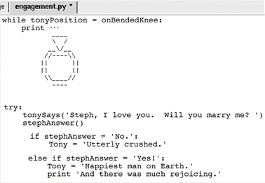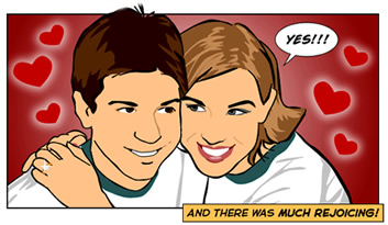 Geek Love: A Marriage Proposal via Code and Comic Nitrozac and I recently ran a very special Joy of Tech comic. We helped one of our geeky fans propose to his girlfriend via the comic! When we heard that Forum member and SuperFan "angryjungman" was thinking of popping the question, we offered to make it a very special day by letting him use the Joy of Tech comic as his proposal medium. After discussing it with Tony and coming up with an idea, we set out to work. Using photo references, Nitrozac turned the young couple into comic illustrations, and depicted a cute story line in which Tony calls his girlfriend over to his computer to read some code that he has written. The Python code she reads is actually a proposal, including an ASCII text art engagement ring... The first comic was posted early Saturday morning, and featured a cliffhanger ending. Would she say yes or would she say no? That afternoon Tony sprang the comic on his unsuspecting girlfriend Steph. Just like in the comic, he called her over to his computer to show her something special... Meanwhile Nitrozac and I, and the members of the geekculture.com Forums and IRC chat rooms were waiting with bated breath for news of her reply. After a nerve-racking eternity, we finally received the good news... she had said YES! I immediately uploaded the conclusion, a "happy ending" comic.
