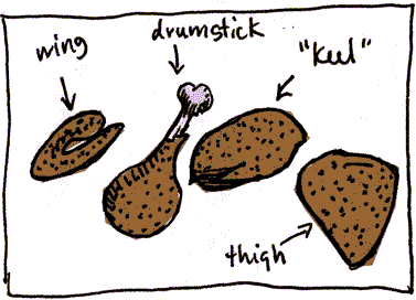 Identifying chicken parts was the only educational thing possible to learn. The chicken packer was on the bottom rung of the Kentucky Fried Chicken corporate ladder. You had to be there for months and flirt with the manager to be able to be promoted to the counter. Just as well, I didn't want to see anyone I knew coming in, it was a small town, don't forget... |